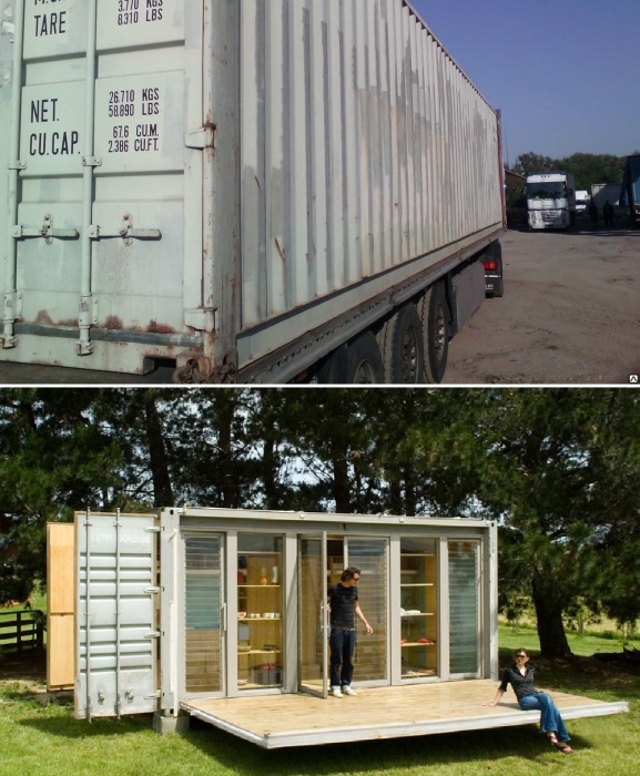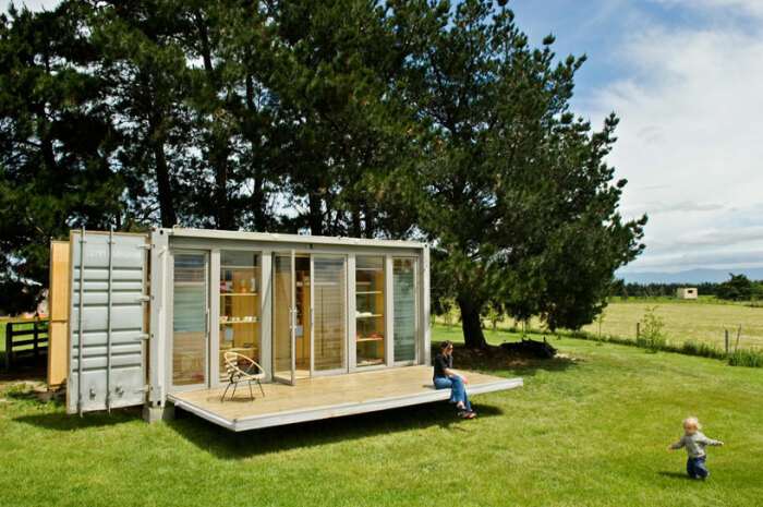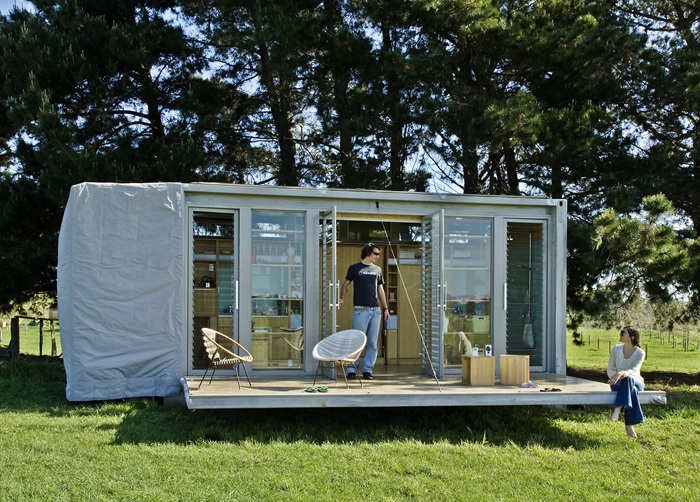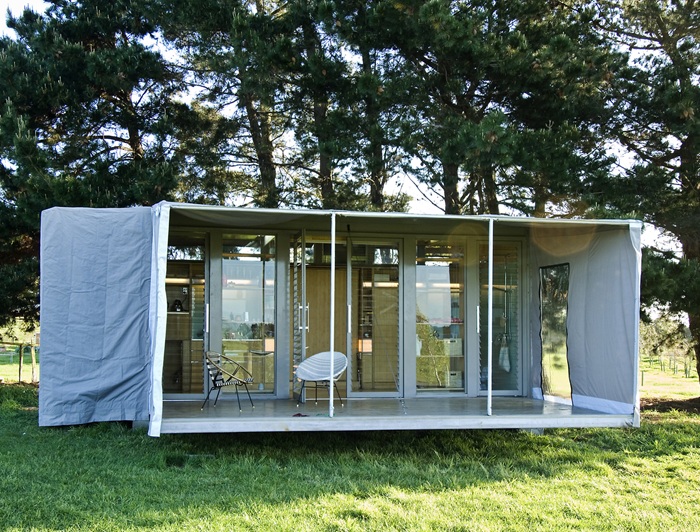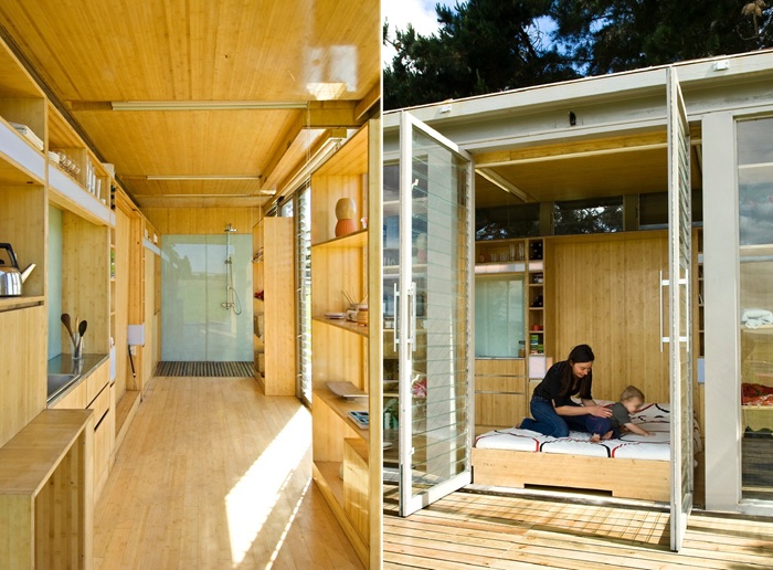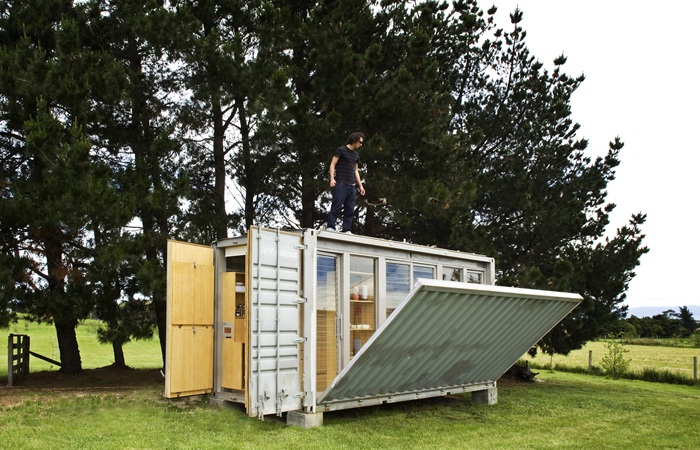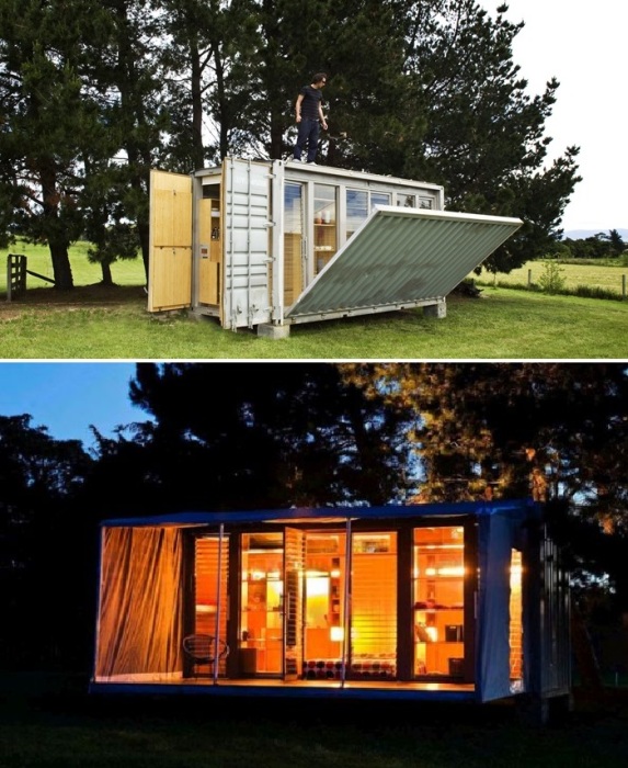 По прибытию на место, контейнер легко превращается в домик пригодный для жизни (Port-a-Bach, Новая Зеландия).