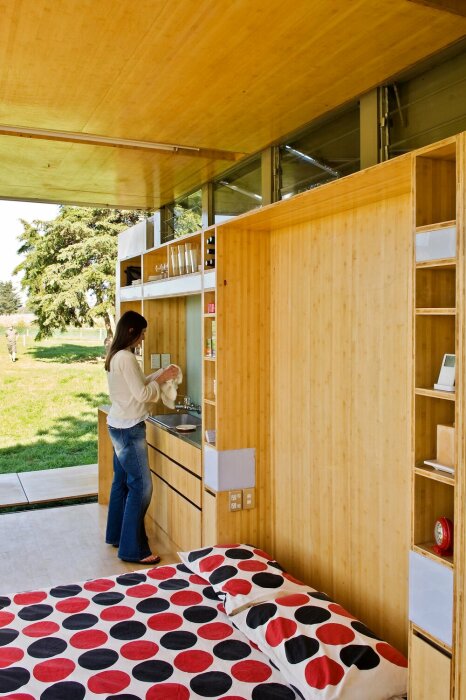 Конструкционные особенности: Структура грузового контейнера, привезенного из Китая, была полностью переосмыслена специалистами Atelierworkshop. После реконструкции три стены из четырех открываются, чтобы служить входом и увеличивать полезную площадь небольшого жилища. Длинная сторона контейнера при откидывании образует придомовую террасу, при этом жилое пространство остается полностью закрытым от ветра и дождя благодаря стеклянной стене с дверями. Над этой частью, как и над торцевыми стенами, одна из которых при открывании обеспечивает двухъярусными кроватями, натягивается не продуваемый и непромокаемый материал, образующий крышу. В условиях Новой Зеландии такого укрытия достаточно, чтобы превратить образовавшиеся пространства в дополнительную жилую площадь.