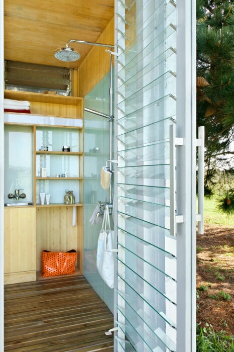 Ванная комната находится за стеклянной дверью (Port-a-Bach, Новая Зеландия). | Фото: homecrux.com.