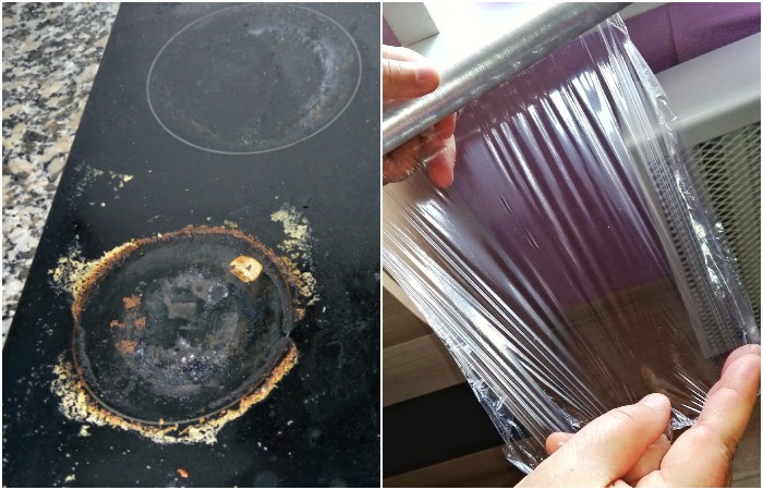 Лайфхак 2: Фен и пищевая пленка для чистки плиты