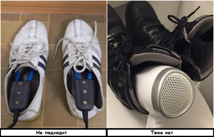 • Использовать фен. Когда вы направляете струю горячего воздуха на обувь, высокая температура повреждает ее не только снаружи, но и внутри. Особенно уязвимыми являются кожаные ботинки, а также изделия из синтетических материалов.