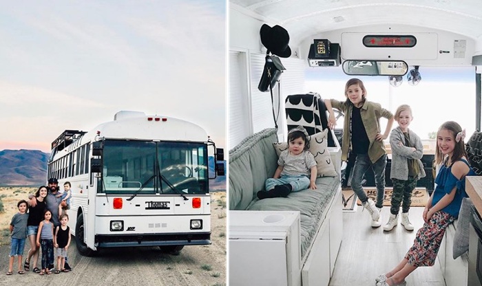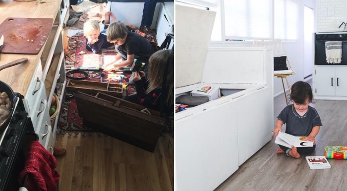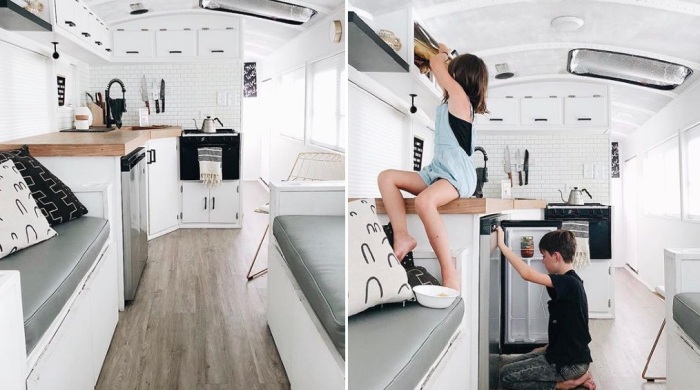 Если говорить о том, что удалось сделать супругам, то они приложили все усилия, чтобы их дети жили в комфортных условиях. В переоборудованном автобусе обустроили уютную и стильную гостиную с диванчиками, со скрытыми системами хранения (преимущественно игрушек, поскольку возраст детей на тот момент был от 2 до 8 лет) и возможностью превращения их в дополнительные спальные места. Они находятся сразу за кабиной и креслом водителя, что позволяет увеличить сектор отдыха для большой семьи. Гостиную пытались превратить в полноценную столовую, но эта практика не прижилась, поскольку постоянное раскладывание обеденного стола, поворот кресла и использование табуретов оказались проблемой, ведь все эти манипуляции нужно было проводить три раза в день, что было очень неудобно. Со временем Дебби поняла, что использование столиков-подносов и организация обедов на улице в хорошую погоду, куда практичней. Особенно, если учесть, что они предусмотрели обустройство террасы на крыше автобуса, так что их трапезы обеспечены приятным окружением и живописными видами.