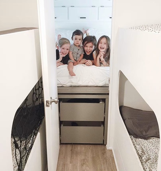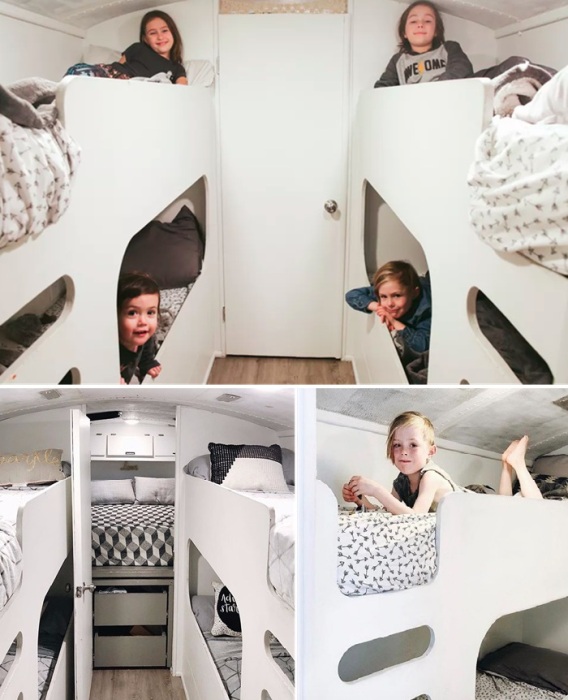 Ванная комната стала разделительным блоком между спальнями и остальным жилым пространством. Сразу за ней установили двухъярусные кровати с противоположных сторон салона. Спальные места являются теми самыми местами уединения, которыми смогли обеспечить детей родители, решившие объединить семью и обеспечить незабываемыми впечатлениями во время путешествий. Каждая из них оборудована скрытыми ящиками для хранения и встроенными светильниками.