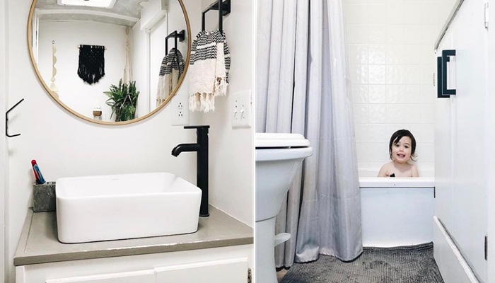 За кухней находится прекрасно оборудованная ванная комната. Супруги при обустройстве душевой отдали предпочтение глубокому поддону, который легко заменяет ванну для старших детей, а вот малышку купают в мойке на кухне, как и стирают. Кроме этого в ванной установлены раковина, встроенная в тумбу, где хранятся все моющие средства и банные принадлежности. Стоит отметить, что стирка является самой большой проблемой для семьи из 6 человек, поскольку под установку стиральной машины так и не удалось выкроить местечко. По этой причине хозяйке приходится изыскивать возможности, чтобы посетить прачечные самообслуживания или напрашиваться к друзьям в гости, которые не против организовать «постирочную вечеринку».