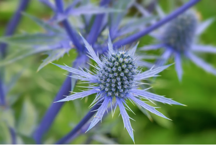 Морской падуб выигрывает не только своим цветом, но и неприхотливостью. Яркие синие цветы станут украшением сухого сада. Это очень долговечное растение с серебристыми листьями.