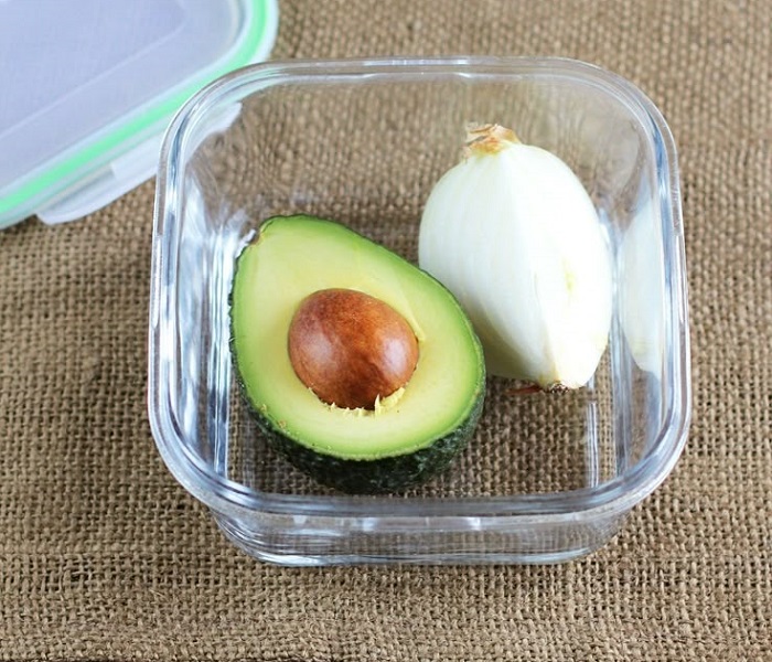 • Храните вместе с луком – положите половинку авокадо в контейнер, а рядом положите разрезанную луковицу (также можно измельчить лук и посыпать им дно емкости). Соединения серы, которые обычно заставляют вас плакать, в случае с авокадо будут работать в качестве антиоксиданта. Плотно накройте контейнер крышкой и отправьте в холодильник.