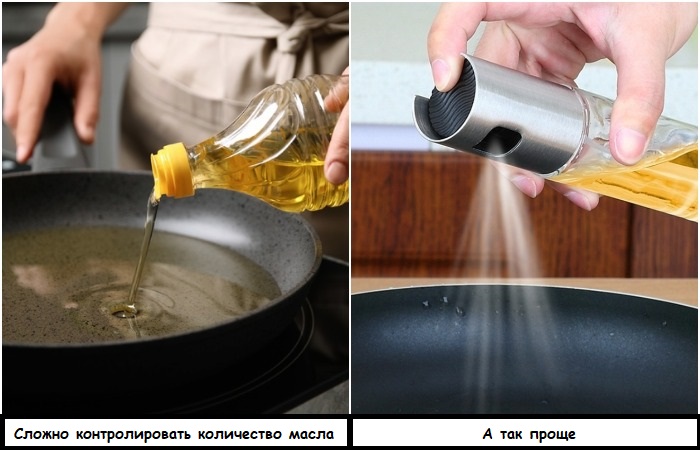 В тех случаях, когда использование масла является обязательным, советуем не наливать его на сковороду или в тарелку с салатом прямо из бутылки, а распылять. Для этих целей идеально подойдут специальные дозаторы, а также помповые пульверизаторы. Всего несколько нажатий, и на поверхности оказалось ровно столько масла, сколько нужно для обжаривания без прилипания. Кстати, дозатор намного удобнее, чем кулинарная кисть для смазывания, ведь его не нужно мыть после каждого применения.