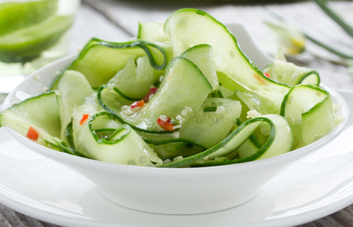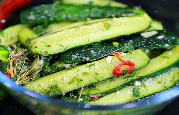 Огурцы для салата можно подготовить с помощью воды. Для этого обязательно срезаем кожуру, а затем разрезаем на две части и погружаем в миску с холодной водой. Добавляем щепотку сахара, соли и любимых специй. Оставляем огурцы на 30 минут, а затем нарезаем нужной формы для салата. Если нет времени и огурцы нужно избавить от горечи за 5 минут, то кладем их в теплую воду с ароматными специями. А затем добавляем в блюдо.