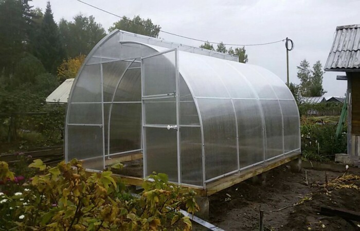 К плюсам относится то, что освещение в теплице благодаря углу наклона очень хорошее, нет потерь тепла, зато азота и углекислого газа много. Но постройка капитальная и место для неё нужно подбирать раз и навсегда.