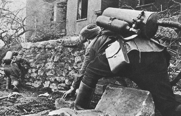 На практике огнемёты использовались для подавления огневых точек и уничтожения живой силы в укрытиях. Советские огнемётчики входили в состав штурмовых инженерно-сапёрных бригад и действовали парами — один нёс огнемёт, второй — автомат и запас горючего. В городских боях и во время штурма укреплений ранцевый огнемёт был очень эффективен, особенно в плотной городской застройке, когда возможные укрытия, узкие улочки и помещения можно было буквально залить огнём. Правда, слабых сторон было не меньше. Огнемётчик сразу становился приоритетной целью, его легко распознавали по громоздкому ранцу, а необходимость подойти почти вплотную к цели делала его уязвимым. В ряде случаев бойцы даже маскировали огнемёты под винтовки или бензобаки, чтобы не привлекать внимания. Огнемётное пламя нельзя было направить под углом или через препятствие, а сам боец нуждался в постоянной защите — его прикрывали с флангов и со спины.