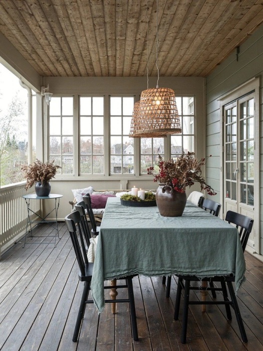 Не стоит воспринимать обеденный стол исключительно как место для трапез. Здесь можно поставить ноутбук и устроить себе рабочее место или использовать стол для занятий с детьми, например, разложить на нем раскраски или какие-то развивающие игры. А если вы занимаетесь хенд-мейдом (вышиваете, рисуете картины по номерам, увлекаетесь декупажем и пр.), то на свежем воздухе это будет делать гораздо приятнее. Плюс стол на веранде идеально подойдет для посиделок с друзьями в компании настольных игр.
