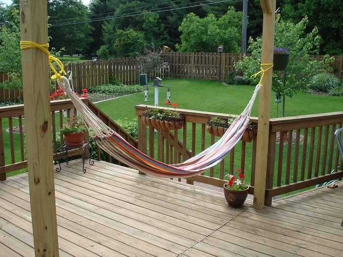 Отличная идея – повесить на веранде гамак. Это намного удобнее, чем искать для него место в саду, ведь не нужно выбирать подходящие деревья или покупать дорогие опоры – достаточно закрепить гамак на потолке или завязать на двух соседних столбых.