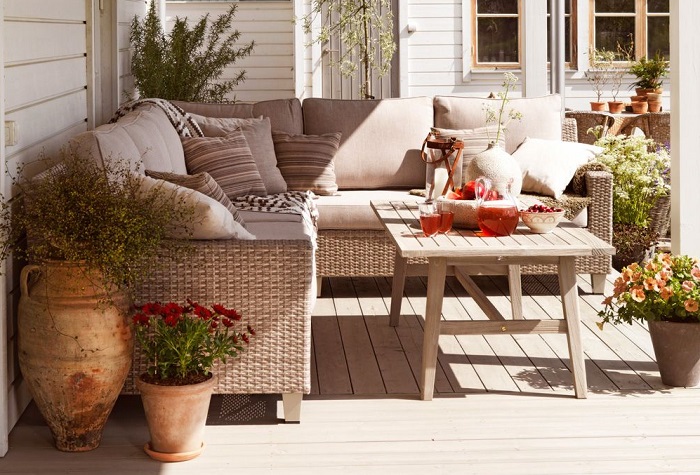 При выборе мебели обращайте внимание на обивку – она должна быть практичной, устойчивой к дождю, простой в уходе (это особенно важно, если у вас открытая веранда). Или же сшейте чехлы из подходящей ткани, которая защитит мебель от различных погодных условий. Кстати, это отличное решение и в том случае, если вам нужно вписать старый потрепанный диван в новый интерьер. Чехол закроет повидавшую жизнь обивку и мебель приобретет совершенно другой внешний вид.