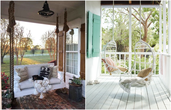 Обычный диван на веранде может выглядеть банально, к тому же он часто занимает много места. Хорошей альтернативой ему станет подвесная скамья-качели, где можно будет с удобством расположиться в любое время. Если цена в магазине не порадует, вы вполне можете сделать качели своими руками. Вместо базового металлического каркаса сделайте конструкцию, состоящую из деревянных брусков и реек. Обратите внимание, что навес и крепление в этом случае должны выдерживать повышенную нагрузку. Качели отлично впишутся в готовый интерьер веранды, хорошо будут сочетаться с креслами, скамейками, ковром и подушками.