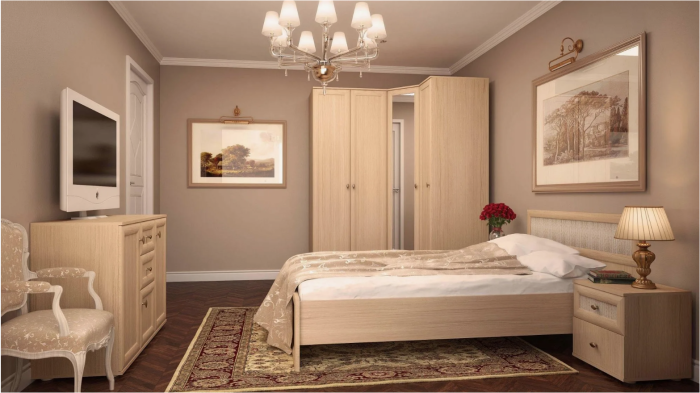 Если в доме жить постоянно, то необходима хорошая спальня. Не просто диван, который будет складываться и раскладываться, а полноценная кровать. Для этого, при возможности, стоит выделить отдельную комнату. Гарнитур включает в себя: кровать, шкаф, комод или тумбочки, те же пуфики и главное массивные шторы, чтобы окно можно было занавесить.