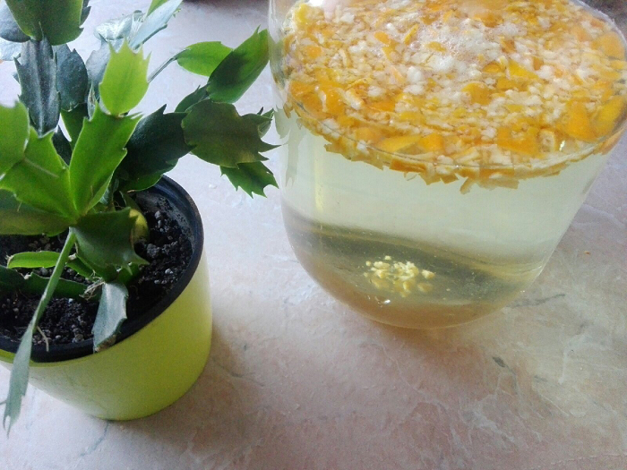 Отличным удобрением для комнатных растений является кожура цитрусовых, а точнее, настой из нее. Для этих целей подойдет шкурка любых фруктов: апельсинов, мандаринов, грейпфрутов, лимонов, лаймов – берите то. Что оказалось под рукой. Витамин С, который входит в состав плодов, обладает антисептическими свойствами, борется с вредителями, помогает улучшить иммунитет цветка.