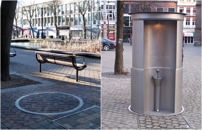 Еще один необычный туалет расположился в самом сердце Великобритании. Подчеркну, что этот экземпляр отличается от предыдущих своей автоматизированностью: в нем имеется специальный механизм, который скрывает туалет под землей в дневное время, а ночью – поднимает его на поверхность.