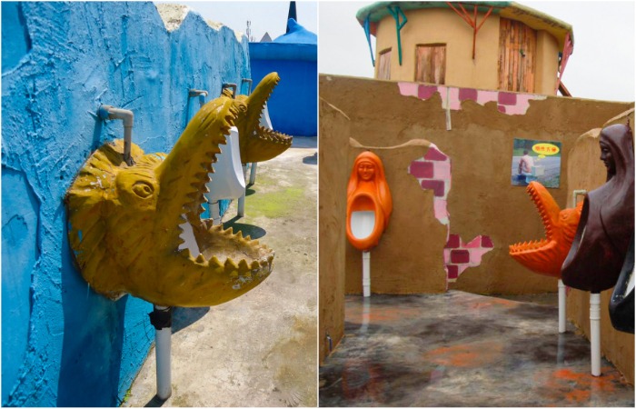 Расположено здание в тематическом парке, известном как «Улица иностранцев». И да, писсуары в этом помещении отличаются не только количеством, но и формой. При желании можно отыскать туалет в форме открытой пасти аллигатора.