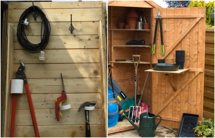 В сарае есть еще одна поверхность, которую можно задействовать для хранения без вреда для общей площади помещения. Мы говорим про двери. Прибейте к ней несколько крючков и повесьте инструменты в удобном порядке. Такой подход не только значительно сэкономит место, но также ускорит поиск нужного инвентаря. Теперь вы не будете бегать из угла в угол, вспоминая, куда же положили маленькие грабли или секатор. Достаточно будет открыть дверь и посмотреть, что же на ней весит.