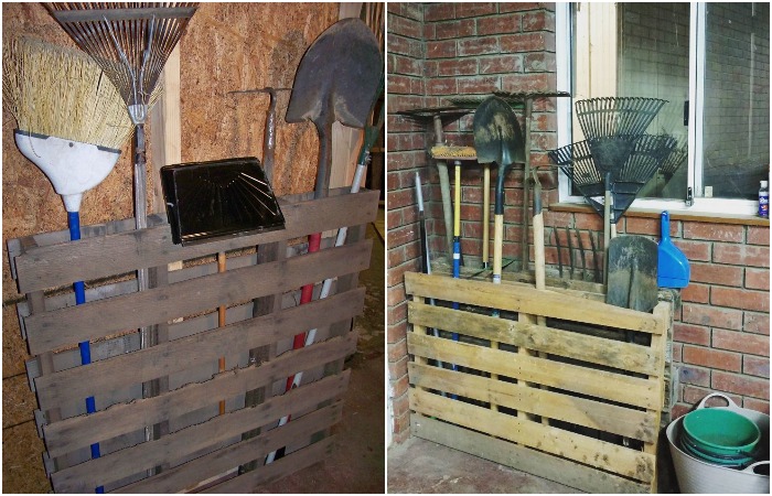 В гараже завалялся старый деревянный поддон? Не торопитесь выбрасывать его, он может стать отличной подставкой для инструментов с длинным черенком. Для начала следует слегка привести его в порядок: очистить от грязи, покрасить или покрыть лаком, в зависимости от того, в каком состоянии он находится. После того, как поддон будет готов, поставьте внутрь него садовые инструменты ручками вниз, чтобы их было удобно брать.