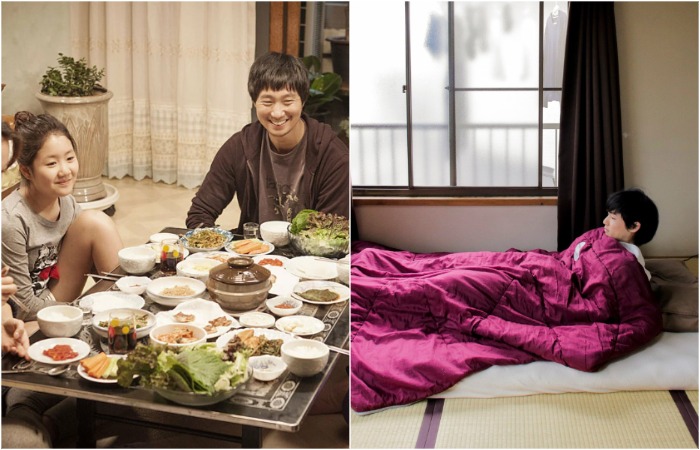 Еще одна причина – экономия пространства. Никаких тебе стульев или кроватей. Хочешь вздремнуть – доставай футон (раскладной матрас), хочешь поесть – присаживайся рядом со столом, накрытым традиционной пищей.