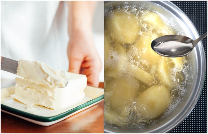 Во-первый, картошку нужно нарезать маленькими кусочками и залить не холодной водой, а кипятком. Далее поставьте кастрюлю на плиту, и как только вода начнет активно бурлить, добавьте секретный ингредиент, который ускорит варку гарнира в несколько раз. Речь идет о сливочном масле. Да-да, вы все правильно поняли.