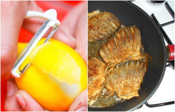 Во-вторых, пористая структура лимонной кожуры работает как своеобразный абсорбент, который впитывает большою часть жирных паров, распространяющих аромат по кухне. Поэтому вместо рыбного запаха вы будете чувствовать свежий цитрусовый.