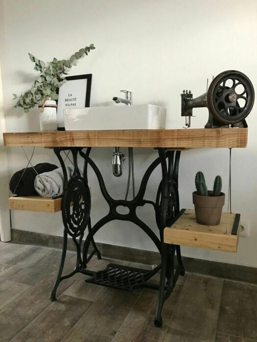 Старинные швейные машины по истине имели невероятное основание. Ножки были ажурными, кованными, очень красивыми. Сейчас такие найти просто невозможно, а если и получится, то стоить такая красота будет очень дорого. Потому, если на даче есть такая старинная швейная машинка, во-первых, можно попробовать научиться на ней что-то шить, а во-вторых, воспользоваться этим основанием для создания чего-то нового. Из этих ножек можно соорудить основание для консоли. Если же вместо маленькой столешницы, на которой находилась сама машинка, заменить на новую и более широкую, то получится отличный обеденный стол, за которым поместится вся семья. Но, стоит помнить, что это основание крайне тяжелое и переносить такой стол с места на место не получится. Но он вполне может стать уличным обеденным столом, за которым можно будет проводить время в тёплые летние дни. Подойдёт для установки на веранде, если его не хочется мочить, или в саду. Также из этого основания можно соорудить подставку под раковину в ванной. Отличный вариант для создания антикварного предмета мебели в любом подходящим для этого интерьере.