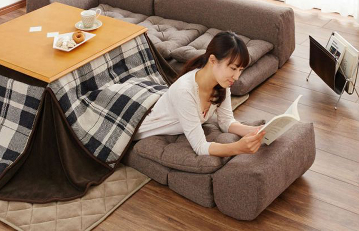 Японцы даже придумали специальные «теплые» обеденные столы «Котацу». Это традиционный низкий стол, под которым располагается небольшой обогреватель. Затем обеденный стол накрывается большим теплым одеялом. Домочадцы садятся за стол на пол, который застелен шерстяным ковром и подушками, а ноги прячут под одеялом. В таком сооружении за считанные минуты становится тепло и уютно. Сейчас в Японии можно встретить обеденные столы уже со встроенным обогревателем. Дома будет достаточно только подобрать по цвету интерьера текстиль.