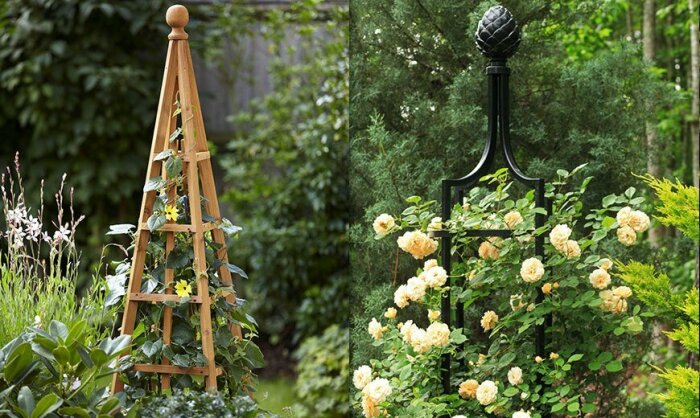 Опоры для вьющихся или ползущих растений тоже являются декоративными фигурами в саду. При этом не обязательно выбирать исключительно типичные арки или перголы, подойдут как пирамиды, так и колонны, или шары из дерева и металла. Их выбирают обычно для таких цветов как розы, либо душистого горошка, пионов и лилий. А также и для других лиан, вроде клематиса. Кроме классических фигур можно взять и выполненные в стиле минимализм, большие железные шары отлично впишутся в широкую композицию. Такие поры подойдут не только для сада и клумбы, но и для огорода, сделают его частью композиции всего участка, более красивым. Стать либо акцентным пятном имея яркий цвет, либо более фоновым, чёрными или серыми.