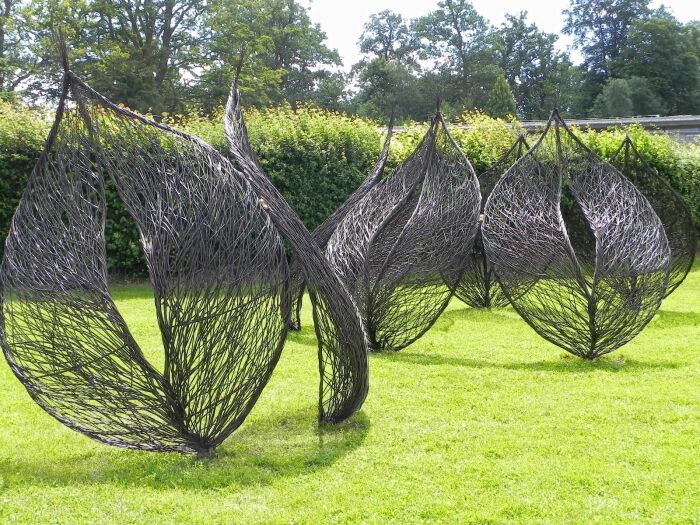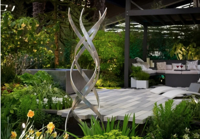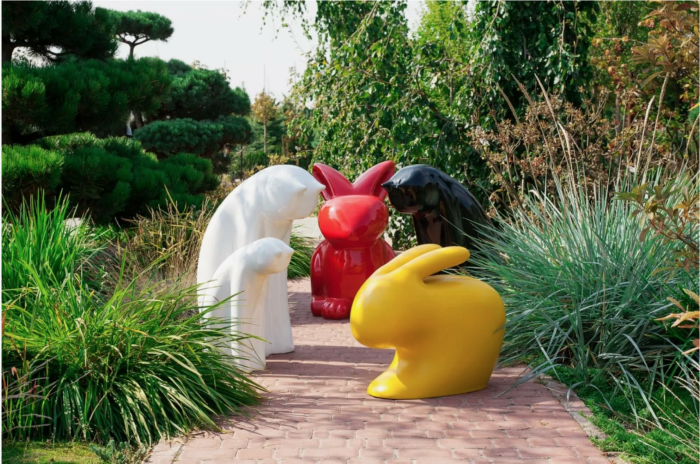 Кроме нестандартных форм можно использовать и привычные для сада и цветника растительные тематики. Такие фигурки в виде цветов и листьев украсят территорию там, где цветы обычно не сажают. Как правило, среди них тоже есть наиболее популярные и универсальные, например, в виде больших одуванчиков, которые иногда бывают и фонарями, зонтиками растений, листьями папоротников или разнообразны тропических растений, а также различными плодами или соцветиями. Они изготавливаются из бетона, отливаясь в формах, либо могут быть сделаны из арматуры или листов металла. Есть крашеные варианты или нержавеющей стали. Стоит отдать предпочтение более натуральным и менее ярким цветам и оттенкам. Дело в том, что в первую очередь они должны выигрышно выделяться, а не смотреться странно и непривычно рядом с натуральными цветами и кустарниками. Есть много более абстрактных и авторских вариантов, они подойдут лучше всего, будет ясно, что они установлены для декора. Это будет стильным решением.