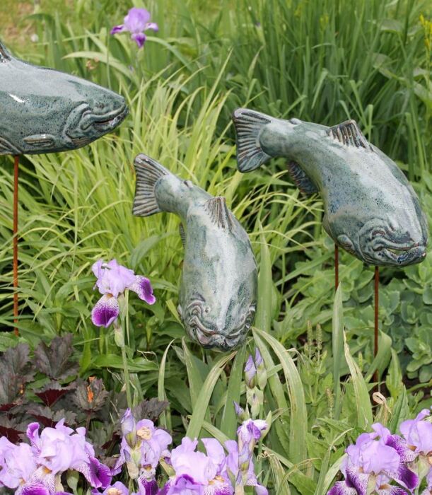 Оригинально будут смотреться специальные скульптуры на опорах, и лучше всего устанавливать их в центре всей цветочной композиции. Самыми лучшими растениями для них будут: можжевельник, спирея, ель и ива. Лучше всего отдать предпочтения более простым и однотонным вариантам. поскольку такой декор и без яркого цвета будет сильно выделяться. К тому же они должны подходить под архитектуру зданий на участке. Самые популярные из парящих скульптур это каты, другие рыбы и весь подводный мир в том числе, насекомые и пернатые. Обычно небольшие скульптуры собирают в целые инсталляции, смотреться будет словно это дизайнерский подход.