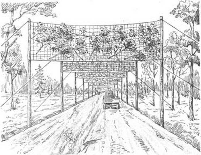 Наддорожные вертикальные маскировочные маски конструировались военными инженерами как из табельных маскировочных сетей, так и из подручных и строительных материалов. Если говорить о последнем способе, то на создание одной 10-метровой маски уходило примерно 3 кг 3-мм проволоки, около 15 погонных метров жердей, полдюжины кольев или анкеров, а также примерно воз веток. К слову, на чёрно-белых снимках из предвоенной Финляндии в воздухе «летают» отнюдь не целые деревья, а отрезанные верхушки и ветви елей. На установку одной такой маскировочной сети при кустарном изготовлении требовалось до 10 человеков-часов. Хотя по мере развития средств наблюдения и оптики описываемый метод маскировки утратил часть своей эффективности, он всё еще используется. Подобные нагромождения на дорогах вполне могли некоторые граждане и на современных фото и видео, ошибочно принимая их за какие-то анти-БПЛА конструкции.