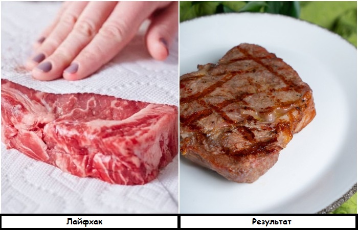 Перед тем, как отправлять мясо или птицу на сковороду, обязательно обсушите его бумажным полотенцем. Благодаря такому простому действию вы избавитесь от лишней влаги и мясо будет действительно жариться.