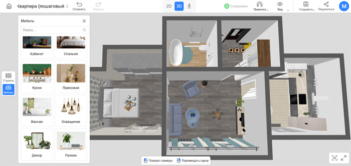 Ключевая особенность онлайн-сервиса в том, что разные системы, конструкции и объекты (мебель, освещение, вентиляция, электропроводка и прочие) находятся в отдельных разделах. Если понадобится переместить мойку, вы случайно не сдвинете холодильник, а при выборе отделки обзор не будут перекрывать предметы обстановки.