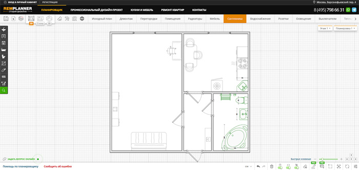 Планировщик квартиры онлайн РумПлан доступен на сайте https://roomplan.ru. Работа над проектом начинается с создания схемы жилища. При помощи удобных инструментов начертите стены, добавьте окна и двери, при необходимости — ниши, колонны и проемы. На следующем этапе выберите отделку. Всего в библиотеке свыше 1400 различных материалов: обои, кирпич, плитка, камень, дерево, линолеум, ламинат, паркет, потолочные панели. Мебель, элементы декора, сантехнику и бытовую электронику вы также найдете в библиотеке.