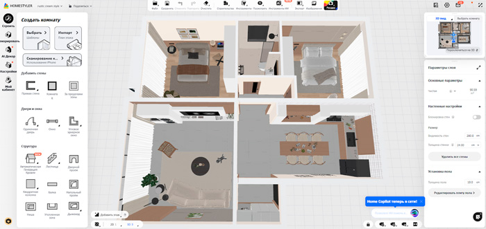 Позволяет сделать проект квартиры онлайн. Вы можете самостоятельно подготовить планировку помещений, воспользоваться шаблонами или призвать на помощь нейросеть. Искусственный интеллект умеет подбирать обстановку к фотографиям реальных комнат, генерировать интерьеры по словесным описаниям и превращать снимки мебели в 3D-модели.