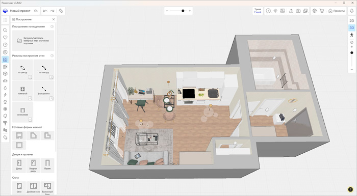 Можно начать проектировать с нуля или сначала загрузить оцифрованную схему. Она добавляется в качестве подложки, а далее необходимо размещать конструкции и объекты по соответствующим контурам. Планоплан предлагает галерею мебели, бытовой техники и отделки. Можно добавлять собственные текстуры.