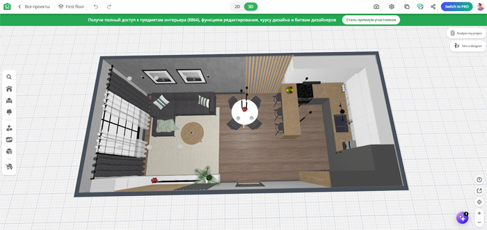 Перед тем как самому сделать дизайн-проект квартиры, создавать аккаунт на сайте не обязательно. Но чтобы получить доступ к просмотру в 3D и всей библиотеке, придется зарегистрироваться и оформить подписку (от 590 руб. в месяц). Также в этом случае откроется функция составления сметы.