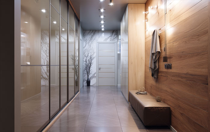 Если прихожая узкая, раздвижные двери с зеркальными фасадами помогут зрительно расширить пространство и добавят комнате света. Важно учитывать и качество фурнитуры — от нее зависит долговечность механизма.