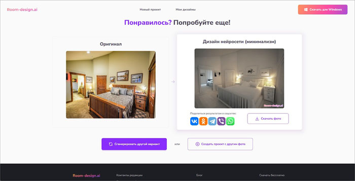 Хотите попробовать другой вариант? Запустите повторную генерацию. Или загрузите другое фото и задайте новые параметры. Вам доступно 3 бесплатных операции в сутки. Если хотите посоветоваться по поводу дизайна с друзьями, поделитесь с ними изображениями по ссылке.