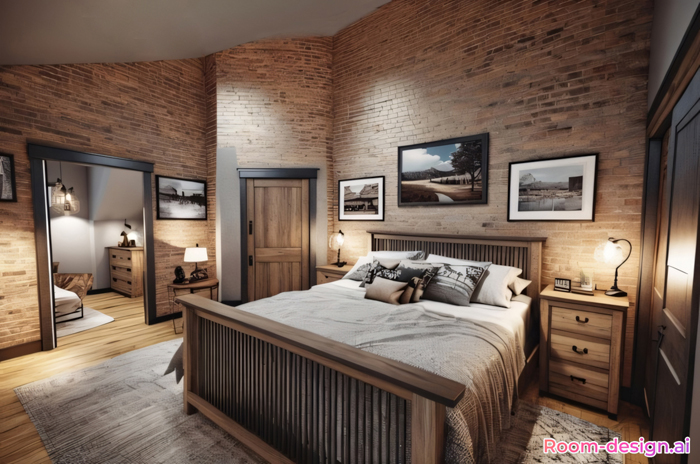 Оцениваем результат. Нейросеть выбрала для оформления мягкую разновидность стиля — home loft. Он лучше подходит для спальни — сочетает урбанистические черты и домашний комфорт. При этом сохранены основные характеристики — открытая кирпичная кладка на стенах, брутальная мебель, настольные лампы в стиле ретро с теплым светом.