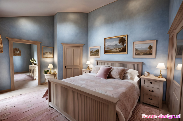 ИИ продемонстрировал хорошее понимание стилистики. Для отделки стен он выбрал штукатурку теплого голубого цвета, а мебель и текстиль выполнены в бежево-розовой гамме. Доски на полу искусственно состарены. Пейзажи на стенах создают умиротворяющую атмосферу. Нейросеть не забыла о небольшом цветовом акценте в виде зелени. Спальня вышла очень уютной.